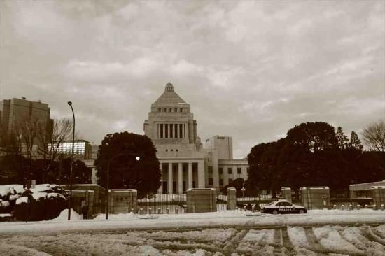 【日本の風景/東京のポストカード】東京都千代田区雪の休日の国会議事堂(白黒)ハガキ photo by MIRO