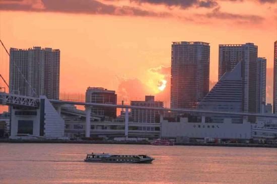 【日本の風景/東京のポストカード】夕景江東区豊洲6丁目から見たレインボーブリッジと船のハガキ photo by MIRO