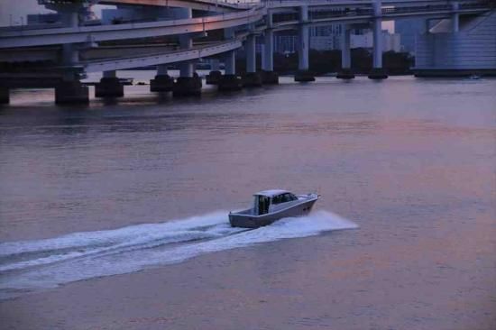 【日本の風景/東京のポストカード】夕景江東区豊洲6丁目から見たレインボーブリッジと船のハガキ photo by MIRO