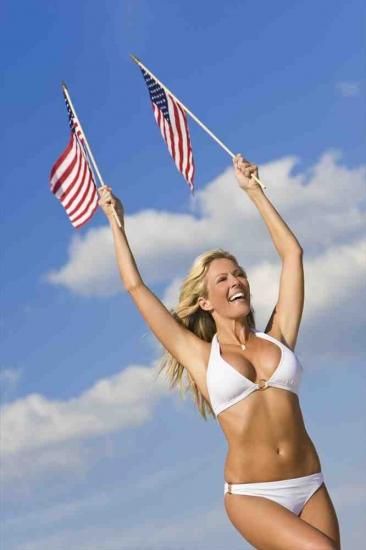 【アメリカのポストカード】アメリカ人白人女性が星条旗を振りながら水着で走るのはがきハガキ葉書