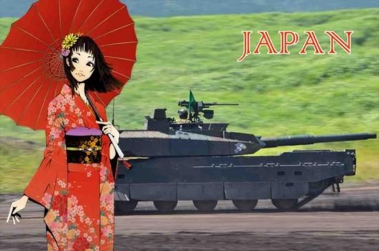 【日本のポストカードAIR】「JAPAN」自衛隊の戦車と着物を着た女性イラストのはがき 絵葉書