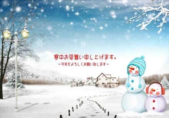 【冬の挨拶ポストカード】「寒中お見舞い申し上げます。 今年もよろしくお願い致します」雪だるまの兄妹イラストの葉書はがきハガキ
