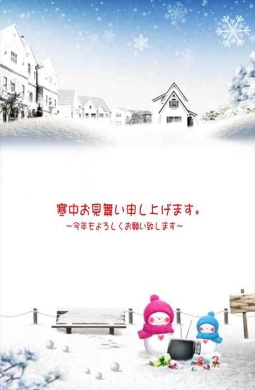 【冬の挨拶ポストカード】「寒中お見舞い申し上げます。 今年もよろしくお願い致します」雪だるまの兄妹イラストの葉書はがきハガキ