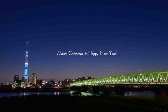 【季節の挨拶ポストカード】「Merry Christmas & Happy New Year 」東京スカイツリーの夜景の葉書はがきハガキ☆