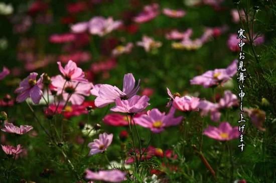 「寒中お見舞い申し上げます」コスモスのある文字入りポストカード絵葉書ハガキはがき