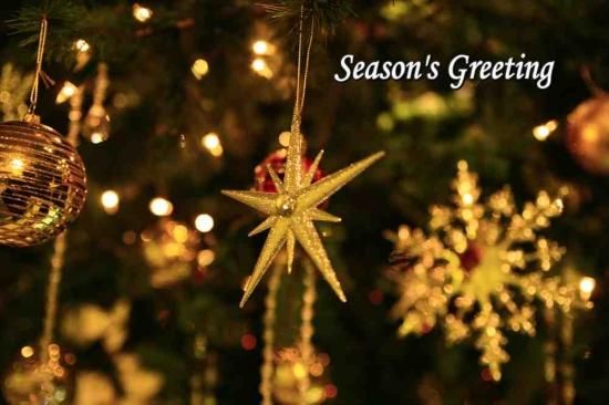 「Season's Greeting」クリスマスツリーとオーナメントのある文字入りポストカード絵葉書ハガキはがき