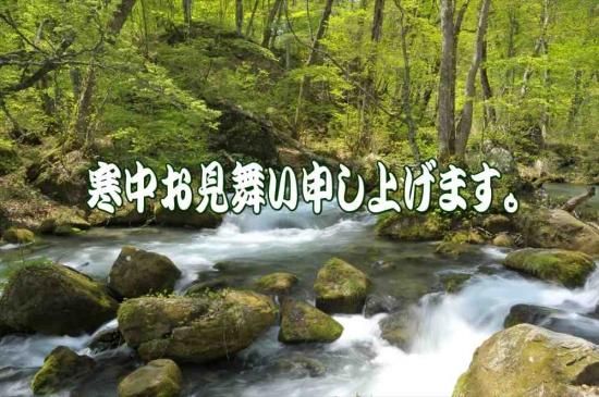 【季節の挨拶ポストカード】「寒中お見舞い申し上げます。」森林と川の風景葉書ハガキはがき