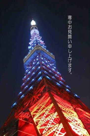 【季節の挨拶ポストカード】「寒中お見舞い申し上げます。」東京タワーの夜の葉書ハガキはがき