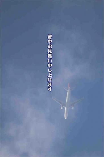 【夏の挨拶ポストカード】「暑中お見舞い申し上げます」空を飛ぶジェット機の葉書ハガキはがき photo by MIRO