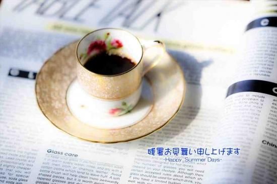 【夏の挨拶ポストカード】「残暑お見舞い申し上げますHappy Summer Days」コーヒーと英字新聞の葉書・ハガキ photo by MIRO