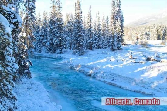 【カナダの観光地ポストカード】「 Alberta, Canada」凍り付いた川と美しい森の葉書・ハガキ photo by MIRO