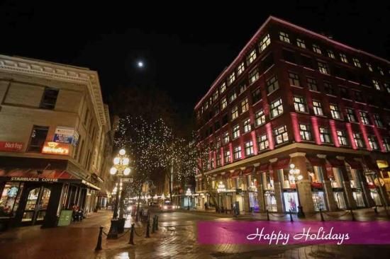 【文字入りポストカード】「Happy Hokidays」バンクーバー、ガスタウンの夜のハガキ photo by MIRO