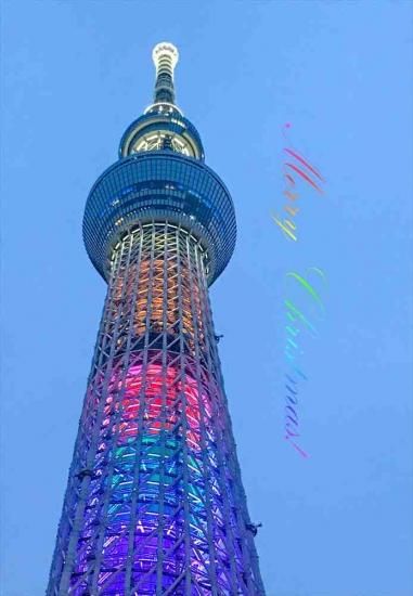 【クリスマスのポストカード】「Merry Christmas」虹色のスカイツリーのハガキ photo by MIRO