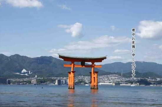 【季節の挨拶ポストカード】「寒中お見舞い申し上げます。」広島宮島大鳥居のハガキ photo by MIRO