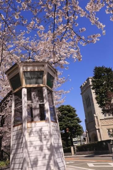 【日本の春の風景ポストカード】神奈川県横浜市中区元町昔の電話ボックスと桜2014年の葉書ハガキはがき photo by MIRO