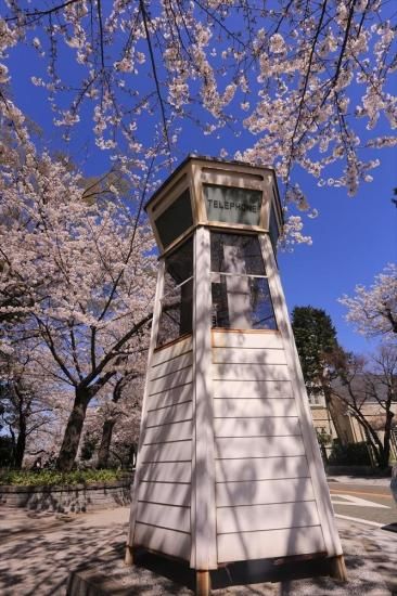 【日本の春の風景ポストカード】神奈川県横浜市中区元町昔の電話ボックスと桜2014年の葉書ハガキはがき photo by MIRO