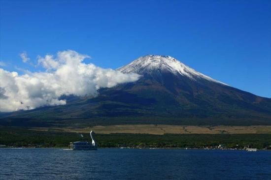 【日本の風景ポストカード】早朝山中湖から見る富士山と山中湖遊覧船「白鳥の湖」の葉書ハガキはがき photo by MIRO