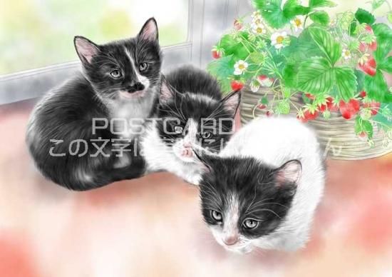 【猫のイラストポストカード】丸まる3匹の子猫-はがき絵葉書postcard-絵彩霞作