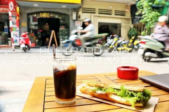 【ベトナムの風景ポストカードのAIR】ベトナム ハノイの街角で朝食(バインミーとコーヒー)のはがきハガキ葉書 撮影/YOSHIO IWASAWA