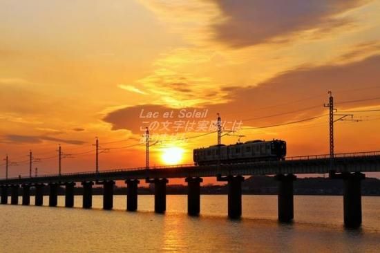 【日本の風景ポストカードLac et Soleil】茨城県 夕暮れの北浦橋梁と電車