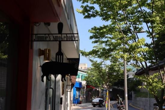 【韓国の風景ポストカード】ソウルソスンラギル小道とショップ豚看板のはがきハガキ葉書